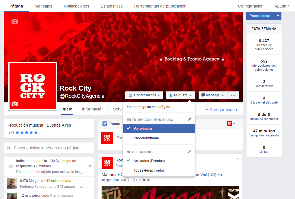 - Además de hacer los posts en la Página de la banda, lo ideal es que ahora cada integrante de "Me Gusta" o comparta el post en su página personal también. Con eso haremos lo que llamamos crecimiento orgánico, donde los contactos al dar un "Me Gusta" a un post de la banda van a tener más visualizaciones de sus contactos directos, ya que van a estar en el segundo lugar del nuevo algoritmo del Facebook. Si no hacemos eso con las publicaciones, va a quedar más difícil viralizar las informaciones y la página va a depender 100% de posts sponsoriados para lograr interacción con el público de la banda.- Dar "Me Gusta" a los posts que hacemos en el Facebook de Rock City Agencia sobre su banda (o de su interés), eso ayuda a viralizar las noticias de su banda. Ahora dar "Me Gusta" como Página de la banda y como perfil personal.